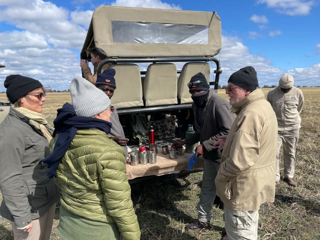 So, a couple of tips on the road. If Neddy asks if you “want to pick a flower behind the vehicle,” he is asking if you need to have a pee. If he says he is “checking for snakes,” he is having a pee. While you are behind the vehicle, you may notice a bucket filled with dried elephant dung hanging from the frame. This can be lighted and will keep the tse tse flies away. The flies come out in the evenings, predominantly, and due to the low temperatures we were experiencing, we hadn’t been bothered by them to this point, and really wouldn’t be for the whole trip. Our trip back took a slightly different path; it’s fascinating how changing the perspective just a little gives such a completely different view. We saw a few more warthogs on the return, doing their prayerful kneeling routine to eat. Their lower mandible is somewhat shorter than their maxilla, so they need to improve their angle of attack for food on the ground so they kneel. It’s pretty clever. And a little bit funny, as Elton John would say. We looked forward to our brunch and our afternoon period when we would have a choice.