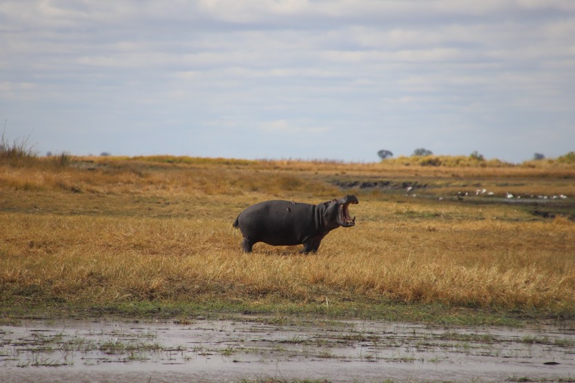 We were headed to a place called the Garden of Eden for our morning tea, which was a pretty lofty name for a place and one that sets a pretty high bar. It is a natural watering hole part of a river that seems to have the perfect profile for wildlife to come grab a drink and settle in for a moment. It did not disappoint. HIPPOS! There was a raft of them in the water and a young male on the shore who was doing his best to show us his teeth and explain why we needed to keep our distance. We had every plan to do so. Hippos have one baby at a time and I can tell you that to me, the baby hippos are the cutest babies in Southern Africa. I could list all of the animals that were here but it would take up a bit of the page so I will let the pictures do that. I’m really enjoying this tea business.